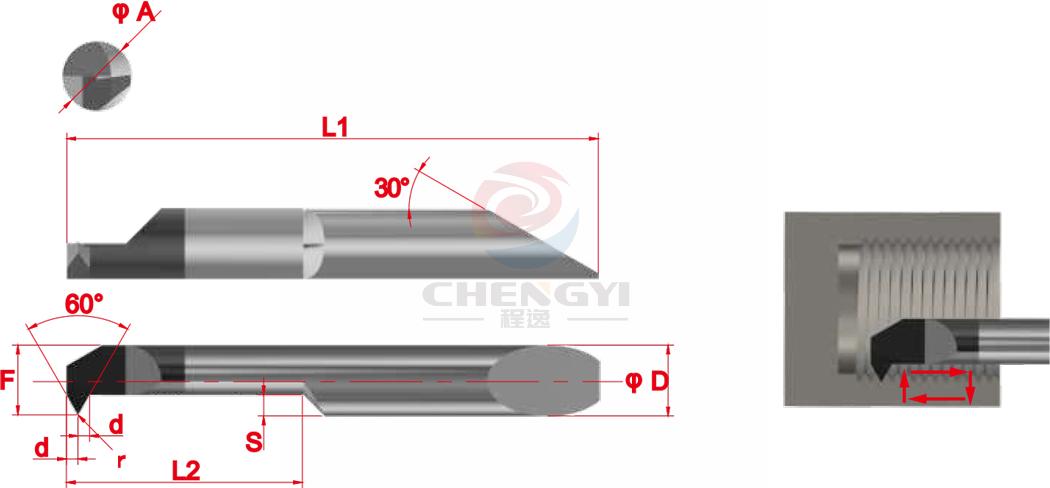 訂購代號 產品型號 最小加工直徑(mm)ØA ØD w r h L1 L2 F S θ 螺距範圍(mm) GIR01 GIR15L04A060 1.5 4 0.03 / 0.250 29 4 1.4 0.4 60° P0.25~P0.4 GIR02 GIR20L06A060 2.0 4 0.04 / 0.305 31 6 1.9 0.5 60° P0.3~P0.5 GIR03 GIR25L08A060 2.5 4 0.06 / 0.375 33 8 2.4 0.6 60° P0.4~P0.6 GIR04 GIR30L10A060 3.0 4 / 0.05 0.605 35 10 2.9 1.0 60° P0.5~P0.8 GIR05 GIR40L12A060X 4.0 4 / 0.05 0.720 37 12 3.9 1.2 60° P0.5~P1.0 GIR06 GIR40L12A060 4.0 4 / 0.10 0.750 37 12 3.9 1.2 60° P1.0~P1.5 GIR07 GIR50L15A060X 5.0 5 / 0.05 0.895 40 15 4.9 1.5 60° P0.5~P1.0 GIR08 GIR50L15A060 5.0 5 / 0.10 0.925 40 15 4.9 1.5 60° P1.0~P1.5 GIR09 GIR60L20A060X 6.0 6 / 0.05 1.070 45 20 5.9 1.8 60° P0.5~P1.0 GIR10 GIR60L20A060 6.0 6 / 0.10 1.095 45 20 5.9 1.8 60° P1.0~P1.75 ※X表示可以加工更小的螺距,從0.4開始。