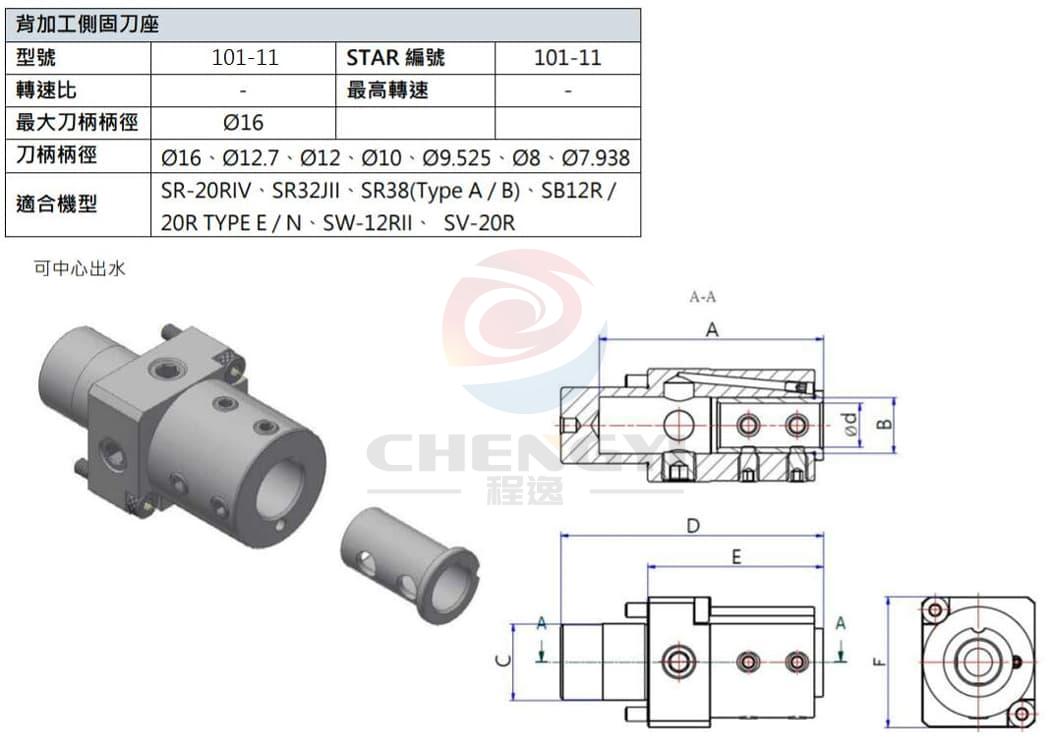 型號 101-11 史達(星牌)編號 101-11 最大刀柄柄徑 Ø16 刀柄柄徑 Ø16、Ø12.7、Ø12、Ø10、Ø9.525、Ø8、Ø7.938 適合機型 SR-20RIV、SR32JII、SR38 (Type A/ B)、SB12R/ 20R、TYPEE/ N、SW-12RI、SV-20R