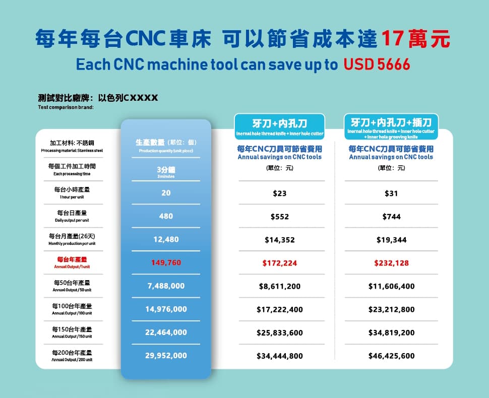 使用程逸內孔刀可為企業節省大量成本。平均而言,每台CNC工具機每年可節省高達 17 萬新台幣(5,666 美元),讓企業能夠自由地將資金再投資於成長和創新。